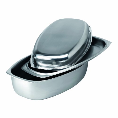 Thanks to its versatile uses such as frying, stewing, braising, browning and as water tub, the unique roaster is ideal as multi-purpose utensil. High-quality multi-layer material, stainless steel and aluminum as well as energy-saving cooking on all hob types are caracteristics of the roasting pan. Details: , Swiss made , Dishwasher safe Length: 44 cm Width: 26 cm Height: 17 cm Volume: 8 L Material: stainless steel, aluminum Kuhn Rikon article number: 3665 , Pack contains:1 Kuhn Rikon La rotissoire Universal Roaster, Roasting Pot, Saute Pan, 44 x 26 cm, 8 L 1 Lid Read more details..