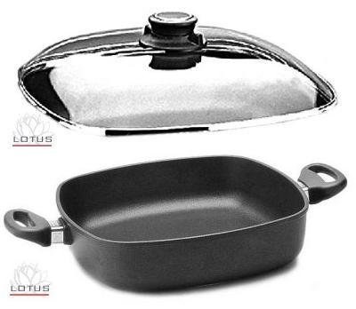 Lotus Cast Iron Pan - Square Casserole 21cm with Glass Lid Made of Safety Glass, Dimension of Bottom 15cm, Height 7.5cm, Dimension of Lid 21cm "Made in Germany" Hand-cast - Aluminium-coquille-cast - hand-casted! Made in Germany - Highly abrasive resistant lotus titan ennobled on inside and outside - To approx. 9-10mm bottom thickness casted and microfine turned down thermophor bottom according to DIN. - Absolutely not to bring out of shape, perfect distribution of heat, energy saving, oven-proof up to 250°C - Lotus blossom effect Read more details..