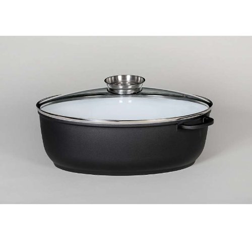 Aluminium cast induction casserole dish/roasting dish with glass lid with steam vent With a white ceramic coating - Aroma knob Induction cooking pot/roasting dish with glass lid and steam vent, 38 cm Diameter for approx. 8 litres. Specially for cooking on induction cooking surfaces can also be used for all common types of cookers. Safe, fast and energy saving. Induction type cookware is over electromagnetic contacts heat, low heat loss. This range can be found in our shop various includes other pots and pans. Features: Roasting Dish/cooking pot - Glass lid with steam vent Aroma button - 100% brand new and high quality white ceramic coating on the inside Greblon Ceram - No dirty edges - Plastic handles which are heat-resistant up to 180 °C - High and very resistant to abrasion and scratches - Temperature resistance - Easy to clean surface - Environmentally responsible manufacturing - PTFE and PFOA. - Material: Die-cast aluminium - Colour: Black/Grey - Size (Height x Width x Depth): approx. diameter 38 x 26 cm x h 12.5 cm - Capacity: Approx. 8 litres /induction base approx. 16 x 29.5 cm - Suitable for the following hob types: electric hob, ceramic glass hob, halogen hob, gas hobs, induction hobs Box Contents: - Genuine New Product as described above Read more details..
